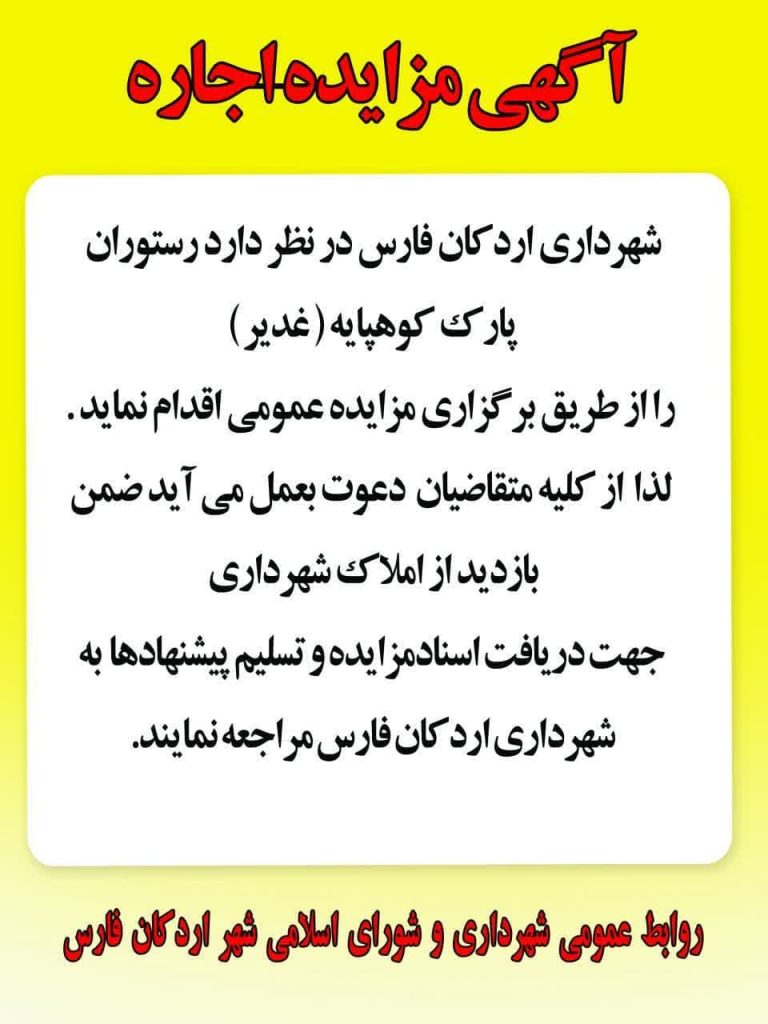 شهرداری اردکان فارس در نظر دارد رستوران پارک کوهپایه ( غدیر ) را از طریق برگزاری مزایده عمومی اقدام نماید . لذا از کلیه متقاضیان دعوت بعمل می آید ضمن بازدید از املاک شهرداری جهت دریافت اسنادمزایده و تسلیم پیشنهادها به شهرداری اردکان فارس مراجعه نمایند.