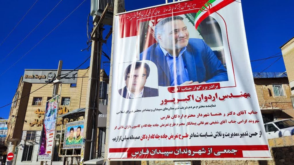 جمعی از شهروندان سپیدانی با نصب بنر از مهندس اکبرپور نماینده مردم شریف شهرستان های سپیدان و بیضاء در مجلس شورای اسلامی و دکتر رهنما شهردار شهر اردکان، پیمانکار و کامیون داران تلاشگر برای اجرای طرح تعریض جاده چله گاه شهر اردکان تقدیر نمودند.
