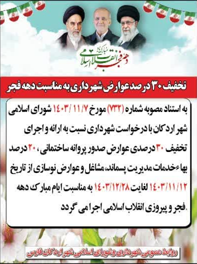 به استناد مصوبه شماره (۷۳۲) مورخ ۷/ ۱۱ / ۱۴۰۳ شورای اسلامی شهر اردکان با درخواست شهرداری نسبت به ارائه و اجرای کاهش ۳۰ درصدی عوارض صدور پروانه ساختمانی ، ۲۰ درصد بها خدمات مدیریت پسماند، مشاغل و عوارض نوسازی از تاریخ ۱۲/ ۱۱/ ۱۴۰۳ لغایت ۱۴۰۳/۱۲/۲۸ به مناسبت ایام مبارک دهه فجر و پیروزی انقلاب اسلامی اجرا می گردد.